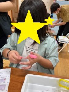 ゴムを伸ばしながら結ぶのは、とても難しいのですが、あきらめずに取り組みました。