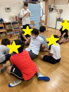 皆で一列になって座ろう。前の子の肩に手を置いて優しくトントンしよう!