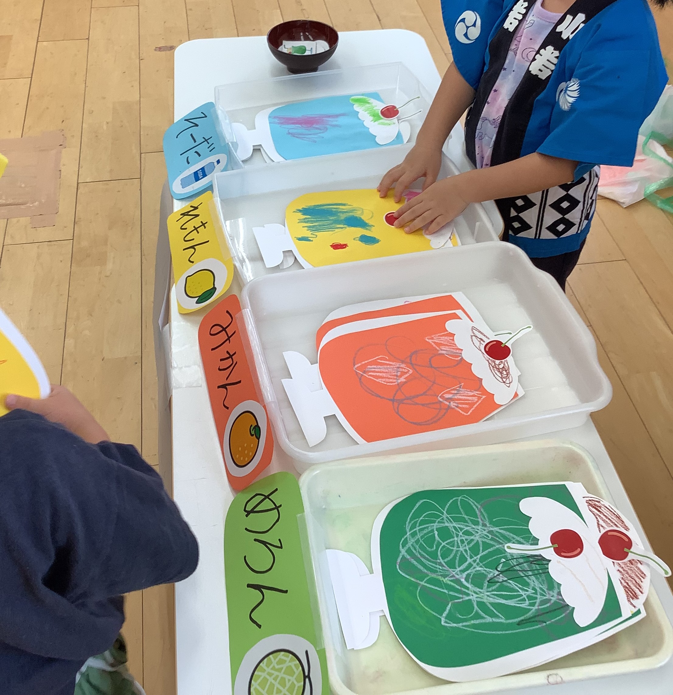 年中・年長の子がメインのクラスでは、自分たちで話し合い「お祭りと言えば?」で
