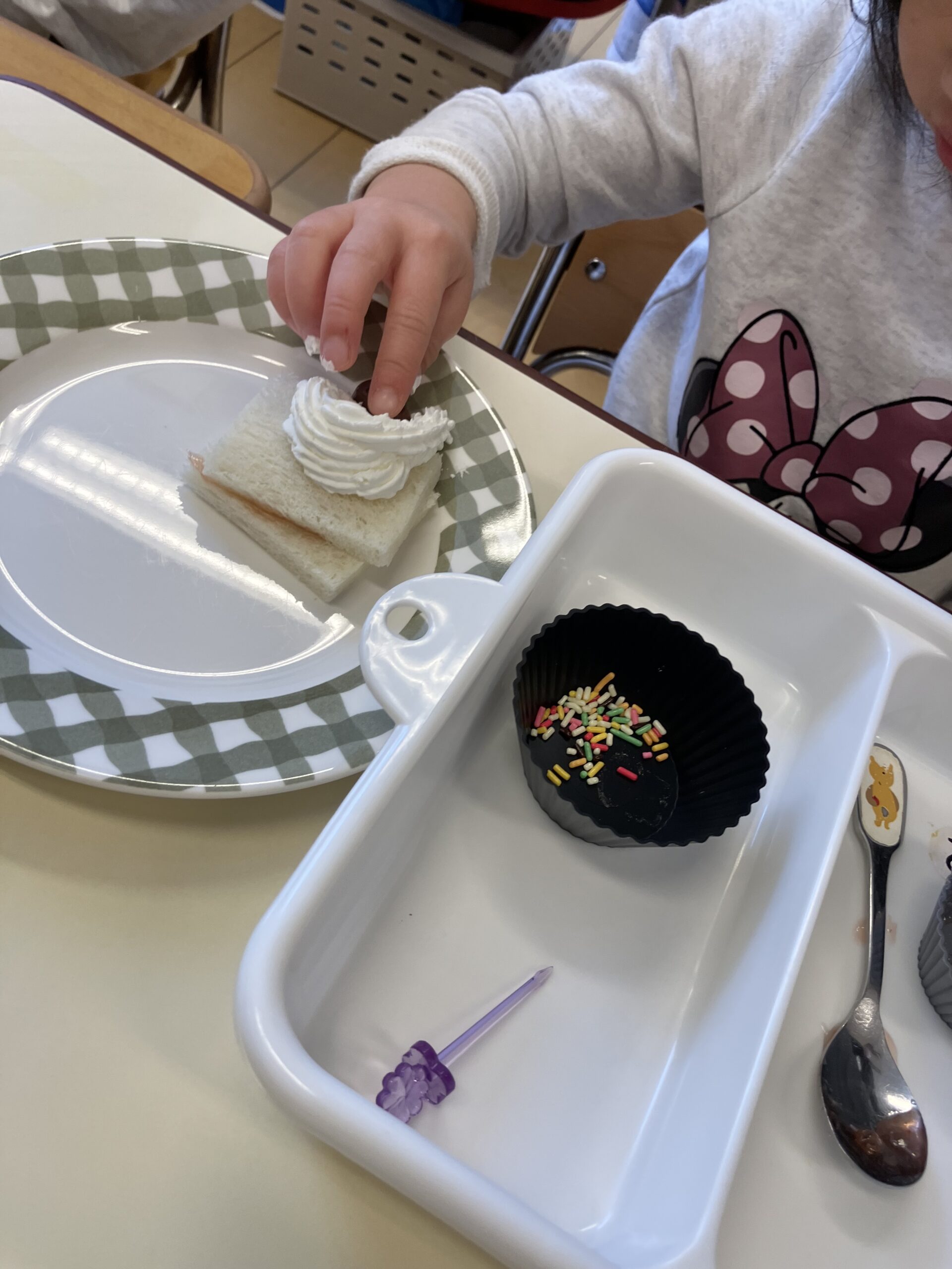 クリームを絞ったり、ジャムをスプーンで塗ったりして、おいしそうにできました。